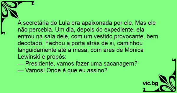 A secretária do Lula era apaixonada por ele. Mas ele não percebia. Um dia, depois do expediente, ela entrou na sala dele, com um vestido provocante, bem decotado. Fechou a porta atrás de si, caminhou languidamente até a mesa, com ares de Monica Lewinski e propôs: