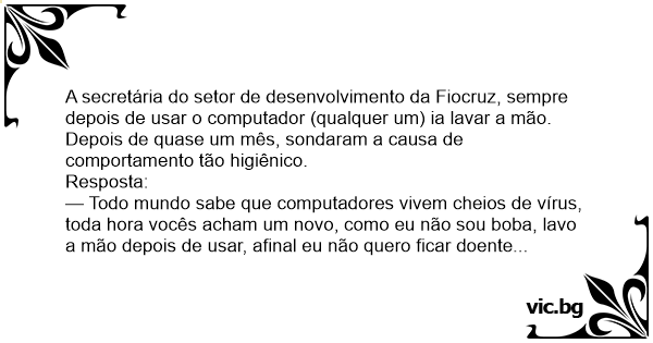 — Todo mundo sabe que computadores vivem cheios de vírus, toda hоrа vocês acham um novo, como eu não sou boba, lavo a mão depois de usar, afinal eu não quero ficar doente...