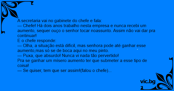 — Chefe! Há dois anos trabalho nesta empresa e nunca recebi um aumento, sequer ouço o senhor tocar noassunto. Assim não vai dar pra continuar!