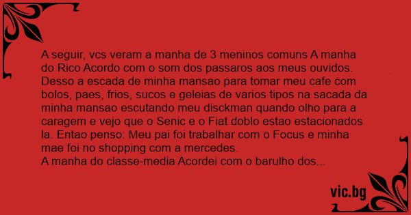 A seguir, vcs veram a manha de 3 meninos comuns A manha do Rico Acordo com o som dos passaros aos meus ouvidos.