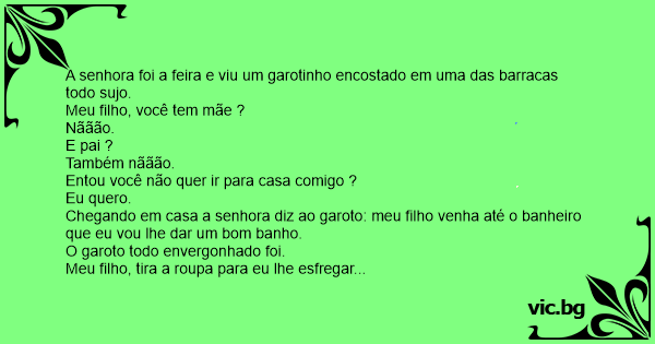 Chegando em casa a senhora diz ao garoto: meu filho venha até o banheiro que eu vou lhe dar um bom banho.