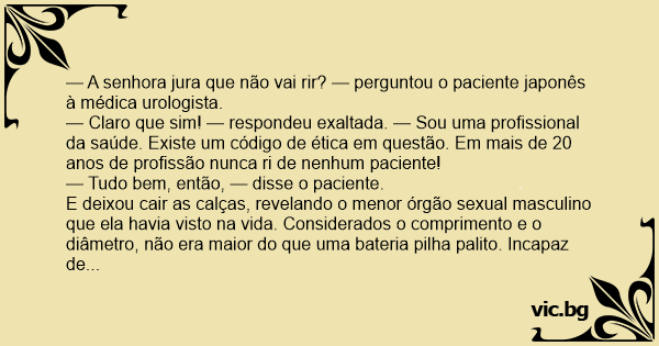 E deixou cair as calças, revelando o menor órgão sеxuаl masculino que ela havia visto na vida. Considerados o comprimento e o diâmetro, não era maior do que uma bateria pilha palito. Incapaz de controlar-se, a médica começou a dar risadinhas e não conseguia mais segurar o ataque de riso. Poucos minutos depois ela conseguiu recuperar a compostura.