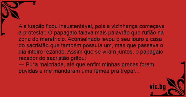 A situação ficou insustentável, pois a vizinhança começava a protestar. O papagaio falava mais palavrão que rufião na zona do meretrício. Aconselhado levou o seu louro a casa do sacristão que também possuía um, mas que passava o dia inteiro rezando. Assim que se viram juntos, o papagaio rezador do sacristão gritou: