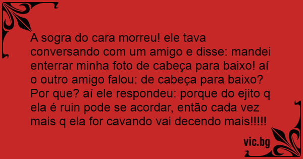 A sogra do cara morreu! ele tava conversando com um amigo e disse: mandei enterrar minha foto de cabeça para baixo! aí o outro amigo falou: de cabeça para baixo? Por que? aí ele respondeu: porque do ejito q ela é ruin pode se acordar, então cada vez mais q ela for cavando vai decendo mais!!!!!