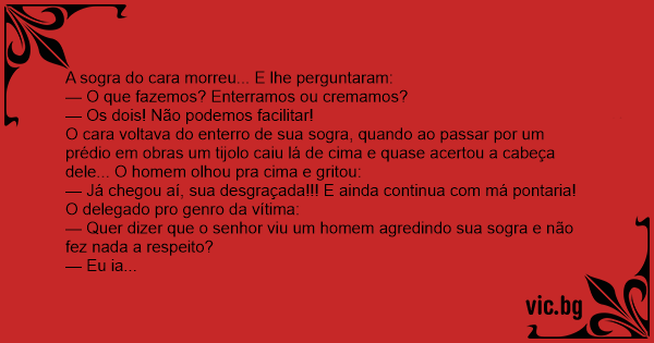 O cara voltava do enterro de sua sogra, quando ao passar por um prédio em obras um tijolo caiu lá de cima e quase acertou a cabeça dele... O homem olhou pra cima e gritou: