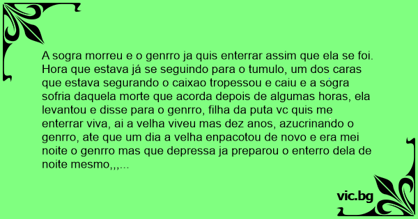 Hora que estava já se seguindo para o tumulo, um dos caras que estava segurando o caixao tropessou e caiu e a sogra sofria daquela morte que acorda depois de algumas horas, ela levantou e disse para o genrro, filha da рuта vc quis me enterrar viva, ai a velha viveu mas dez anos, azucrinando o genrro, ate que um dia a velha enpacotou de novo e era mei noite o genrro mas que depressa ja preparou o enterro dela de noite mesmo,,, so que ai ele foi mas esperto, os parentes levava o caixao e ele ia na frente com o farolete dizendo,,,,o buraco, o toco, , cuidado com o toco.