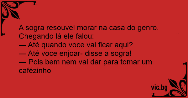 A sogra vai visitar a filha e o genro. Ela toca a campainha ai o genro abre a porta empolgado: — Sogrinha a quanto tempo não te vejo! Quanto tempo vai ficar desta vez? Querendo ser gentil a sogra...