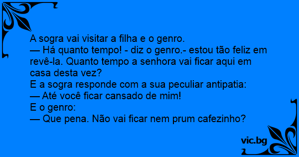 A sogra vai visitar a filha e o genro. Ela toca a campainha ai o genro abre a porta empolgado: — Sogrinha a quanto tempo não te vejo! Quanto tempo vai ficar desta vez? Querendo ser gentil a sogra...