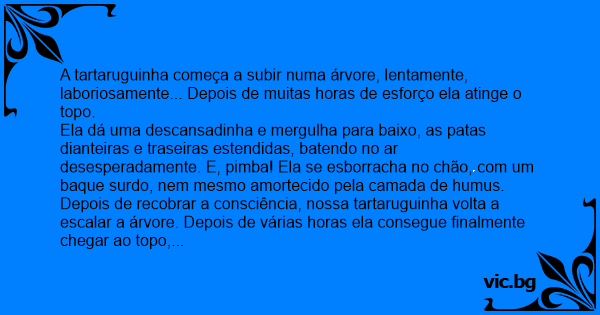 Depois de recobrar a consciência, nossa tartaruguinha volta a escalar a árvore. Depois de várias horas ela consegue finalmente chegar ao topo, descansa um pouquinho e salta novamente, esborrachando-se novamente no chão.