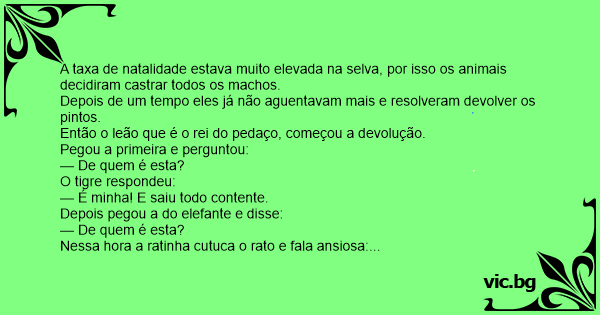 A taxa de natalidade estava muito elevada na selva, por isso os animais decidiram castrar todos os machos.