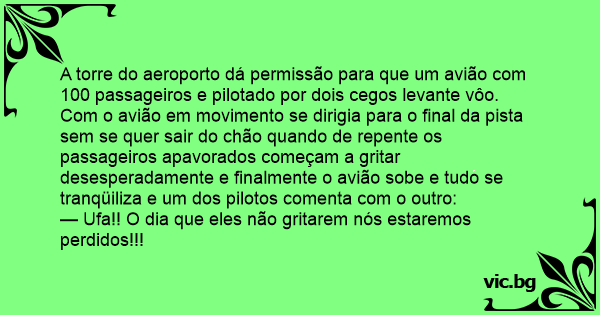 A torre do aeroporto dá permissão para que um avião com 100 passageiros e pilotado por dois cegos levante vôo. Com o avião em movimento se dirigia para o final da pista sem se quer sair do chão quando de repente os passageiros apavorados começam a gritar desesperadamente e finalmente o avião sobe e tudo se tranqüiliza e um dos pilotos comenta com o outro: