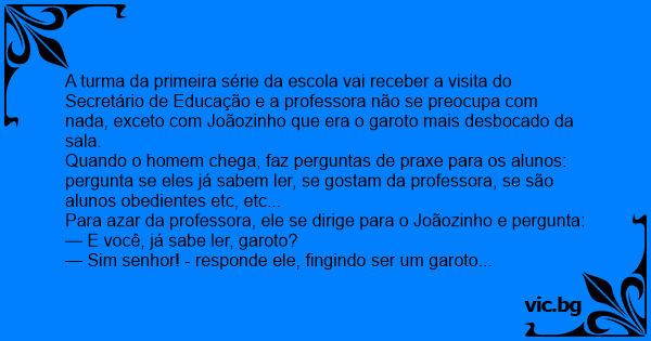 A professora começa a tremer e suar frio, esperando pelo pior. E Joãozinho pensa, pensa e responde:
