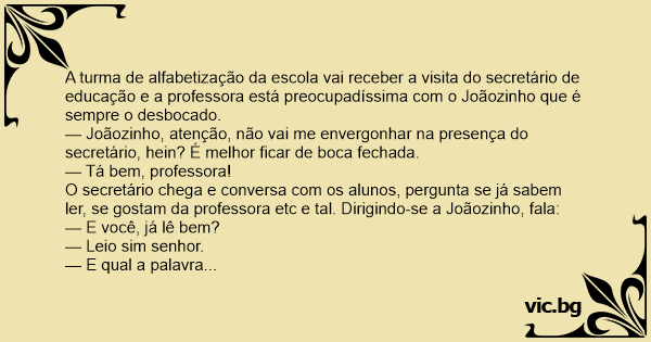A turma de alfabetização da escola vai receber a visita do secretário de educação e a professora está preocupadíssima com o Joãozinho que é sempre o desbocado.