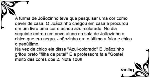 Na vez de chico ele disse "Azul-colorado" E Joãozinho gritou preto "filha da рuта!" E a professora fala "Gostei muito das cores dos 2. Nota 100!!