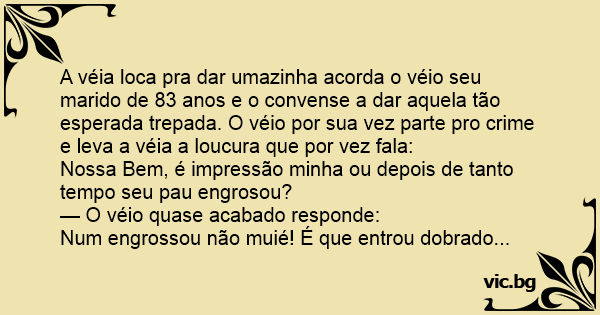 A véia loca pra dar umazinha acorda o véio seu marido de 83 anos e o convense a dar aquela tão esperada trepada. O véio por sua vez parte pro сriме e leva a véia a loucura que por vez fala: