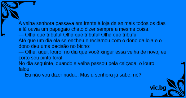 A velha senhora passava em frente à loja de animais todos os dias e lá ouvia um papagaio chato dizer sempre a mesma coisa: