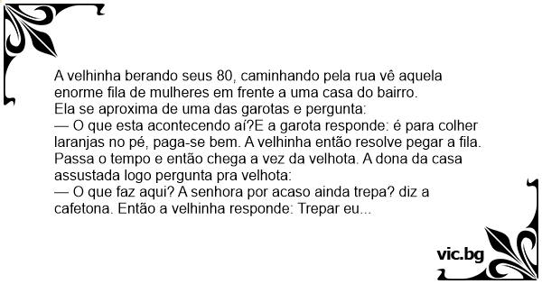 — O que esta acontecendo aí?E a garota responde: é para colher laranjas no pé, paga-se bem. A velhinha então resolve pegar a fila.