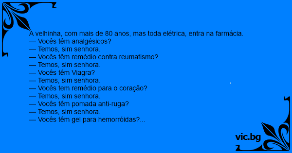 A velhinha, com mais de 80 anos, mas toda elétrica, entra na farmácia.