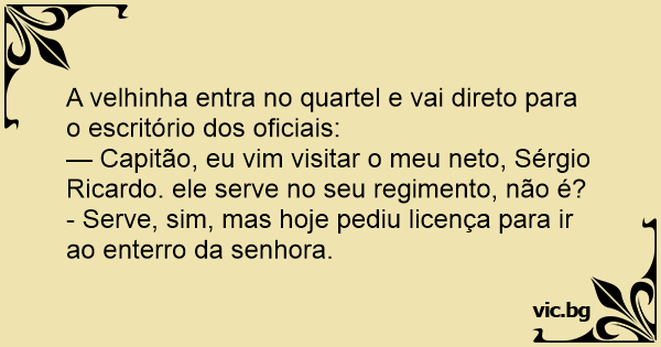 — Capitão, eu vim visitar o meu neto, Sérgio Ricardo. ele serve no seu regimento, não é? - Serve, sim, mas hoje pediu licença para ir ao enterro da senhora.