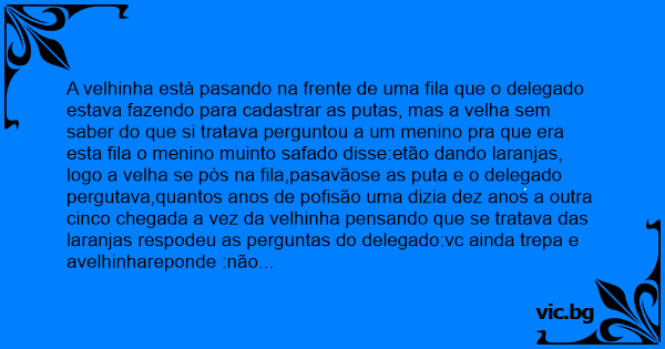 A velhinha està pasando na frente de uma fila que o delegado estava fazendo para cadastrar as putas, mas a velha sem saber do que si tratava perguntou a um menino pra que era esta fila o menino muinto safado disse:etão dando laranjas, logo a velha se pòs na fila,pasavãose as рuта e o delegado pergutava,quantos anos de pofisão uma dizia dez anos a outra cinco chegada a vez da velhinha pensando que se tratava das laranjas respodeu as perguntas do delegado:vc ainda trepa e avelhinhareponde :não mas chupo