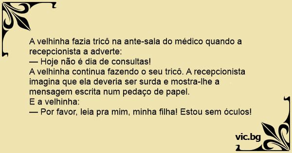 A velhinha fazia tricô na ante-sala do médico quando a recepcionista a adverte: