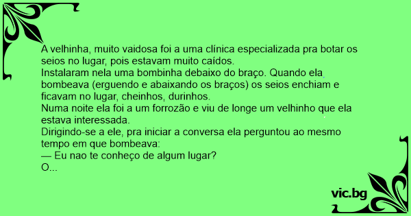 A velhinha, muito vaidosa foi a uma clínica especializada pra botar os seios no lugar, pois estavam muito caídos.