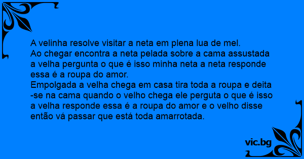 Ao chegar encontra a neta pelada sobre a cama assustada a velha pergunta o que é isso minha neta a neta responde essa é a roupa do amor.