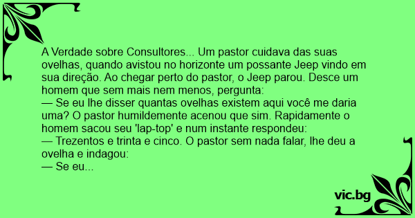 — Se eu adivinhar sua profissão posso ter a ovelha de volta? - Sim. - O senhor é 'consultor'! Estupefato, o homem devolve a ovelha ao pastor, mas não sem antes perguntar como ele adivinhou. - O senhor chegou aqui sem ser chamado, se meteu no meu negócio, me disse o que eu já sabia e ainda cobrou por isso!