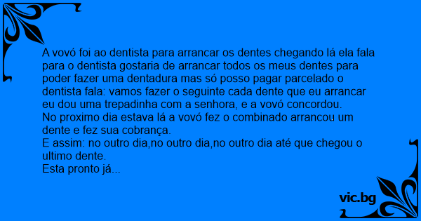 A vovó foi ao dentista para arrancar os dentes chegando lá ela fala para o dentista gostaria de arrancar todos os meus dentes para poder fazer uma dentadura mas só posso pagar parcelado o dentista fala: vamos fazer o seguinte cada dente que eu arrancar eu dou uma trepadinha com a senhora, e a vovó concordou.