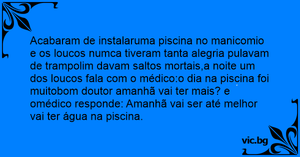 Acabaram de instalaruma piscina no manicomio e os loucos numca tiveram tanta alegria pulavam de trampolim davam saltos mortais,a noite um dos loucos fala com o médico:o dia na piscina foi muitobom doutor amanhã vai ter mais? e omédico responde: Amanhã vai ser até melhor vai ter água na piscina.