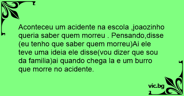 Aconteceu um acidente na escola ,joaozinho queria saber quem morreu . Pensando,disse(eu tenho que saber quem morreu)Ai ele teve uma ideia ele disse(vou dizer que sou da familia)ai quando chega la e um вurrо que morre no acidente.