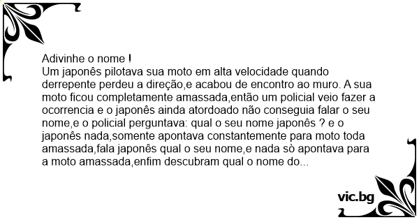 Um japonês pilotava sua moto em alta velocidade quando derrepente perdeu a direção,e acabou de encontro ao muro. A sua moto ficou completamente amassada,então um policial veio fazer a ocorrencia e o japonês ainda atordoado não conseguia falar o seu nome,e o policial perguntava: qual o seu nome japonês ? e o japonês nada,somente apontava constantemente para moto toda amassada,fala japonês qual o seu nome,e nada sò apontava para a moto amassada,enfim descubram qual o nome do japonês?