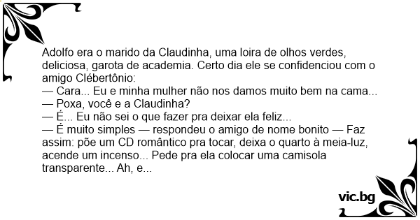 Adolfo era o marido da Claudinha, uma loira de olhos verdes, deliciosa, garota de academia. Certo dia ele se confidenciou com o amigo Clébertônio: