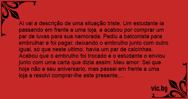 Ai vai a descrição de uma situação triste. Um estudante ia passando em frente a uma loja, e acabou por comprar um par de luvas para sua namorada. Pediu a balconista para embrulhar e foi pagar, deixando o embrulho junto com outro igual, só que neste ultimo, havia um par de calcinhas. Acabou que o embrulho foi trocado e o estudante o enviou junto com uma carta que dizia assim: Meu amor: Sei que hoje não e seu aniversario, mas passei em frente a uma loja e resolvi comprar-lhe este presente, mesmo sabendo que você não costuma usar, mas eram muito bonitas. Não sei se e do seu tamanho nem se você gosta da cor, mas a balconista experimentou na minha frente e eu gostei muito. Ficaram um pouco larguinhas na frente e dos lados mas assim as amos entram com maior facilidade alem de deixar os dedos mais livres para se movimentarem, fazendo também com que fique mais fácil de tira-las. A balconista mandou lembrar que ponha um talquinho quando tira-las a fim de evitar o mau cheiro. Meu amor, gostaria muito que as usasse, pois elas cobrirão o que lhe pedirei algum dia. Um grande beijo aonde vai usa-las.