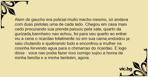 Alem de gaucho era policial muito macho mesmo, só andava com duas pistolas uma de cada lado. Chegou em casa mais cedo procurando sua prenda passou pela sala, quarto da gurizada,bannheiro nao achou, foi para seu quarto ao entrar viu a cena o ricardao totalmente nú em sua cama,endoidou ja saiu chutando e quebrando tudo e encontrou a mulher na cosinha fervendo agua para o chimarrao do ricardao. E logo disse - voce nao podia fazer isso comigo sujou a honra de minha família e a minha também, agora vou matar os dois e ja chutou o fogao com chaleira e tudo. Á mulher ja revoltada disse.