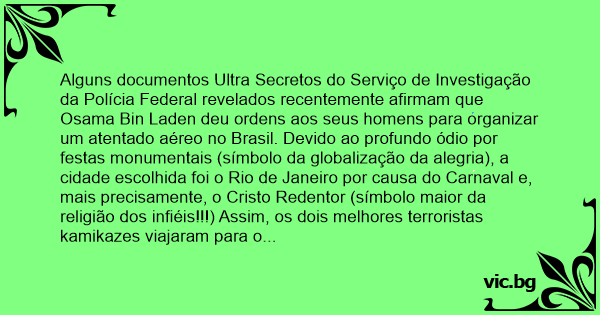 Alguns documentos Ultra Secretos do Serviço de Investigação da Polícia Federal revelados recentemente afirmam que Osama Bin Laden deu ordens aos seus homens para organizar um atentado aéreo no Brasil. Devido ao profundo ódio por festas monumentais (símbolo da globalização da alegria), a cidade escolhida foi o Rio de Janeiro por causa do Carnaval e, mais precisamente, o Cristo Redentor (símbolo maior da religião dos infiéis!!!) Assim, os dois melhores terroristas kamikazes viajaram para o Brasil. Os dois chegaram ao Rio de Janeiro determinados a impor o castigo de Allah aos infiéis tupiniquins. A missão, felizmente, não teve sucesso, conforme os registros da Polícia Federal enviados ao FHC, ao Bush e ao Papa.