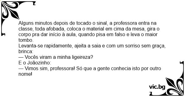 Alguns minutos depois de tocado o sinal, a professora entra na classe, toda afobada, coloca o material em cima da mesa, gira o corpo pra dar início à aula, quando pisa em falso e leva o maior tombo.