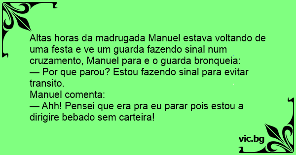 Altas horas da madrugada Manuel estava voltando de uma festa e ve um guarda fazendo sinal num cruzamento, Manuel para e o guarda bronqueia: