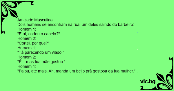 "Falou, até mais. Ah, manda um beijo prá gostosa da tua mulher."