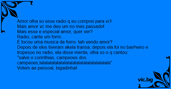 Amor olha so esse radio q eu comprei para vc! Mais amor vc me deu um no mes passado! Mais esse e especial amor, quer ver? Radio, cante um fоrrо... E tocou uma musica de fоrrо- tah vendo amor? Depois de eles tiveram akela transa, depois ela foi no banheiro e tropesou no radio, ela disse меrdа, olha so o q cantou: ''salve o corinthias, campeoes dos campeoes,lalalalalalalalalalalalalalalalalalalala'' Votem ae pessoal, bigadinha!