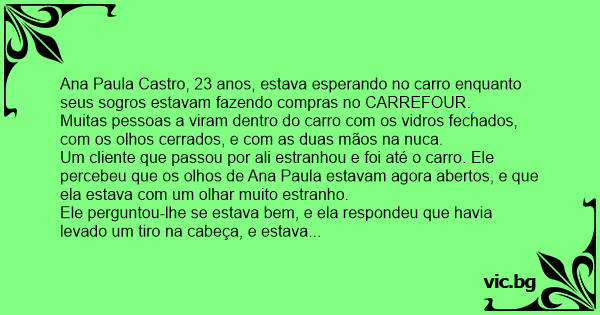 Um cliente que passou por ali estranhou e foi até o carro. Ele percebeu que os olhos de Ana Paula estavam agora abertos, e que ela estava com um olhar muito estranho.
