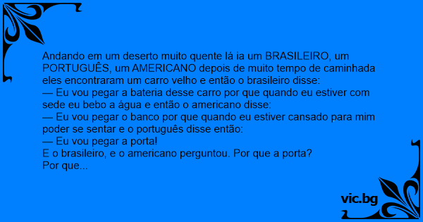 Andando em um deserto muito quente lá ia um BRASILEIRO, um PORTUGUÊS, um AMERICANO depois de muito tempo de caminhada eles encontraram um carro velho e então o brasileiro disse:
