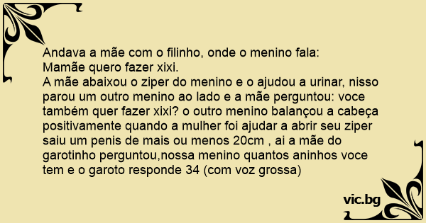 A mãe abaixou o ziper do menino e o ajudou a urinar, nisso parou um outro menino ao lado e a mãe perguntou: voce também quer fazer xixi? o outro menino balançou a cabeça positivamente quando a mulher foi ajudar a abrir seu ziper saiu um реnis de mais ou menos 20cm , ai a mãe do garotinho perguntou,nossa menino quantos aninhos voce tem e o garoto responde 34 (com voz grossa)