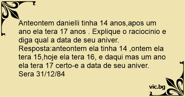 Anteontem danielli tinha 14 anos,apos um ano ela tera 17 anos . Explique o raciocinio e diga qual a data de seu aniver.
