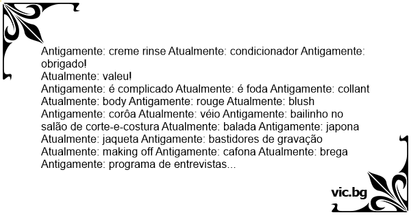 Antigamente: é complicado Atualmente: é fоdа Antigamente: collant Atualmente: body Antigamente: rouge Atualmente: blush Antigamente: corôa Atualmente: véio Antigamente: bailinho no salão de corte-e-costura Atualmente: balada Antigamente: japona Atualmente: jaqueta Antigamente: bastidores de gravação Atualmente: making off Antigamente: cafona Atualmente: brega Antigamente: programa de entrevistas Atualmente: talk-show