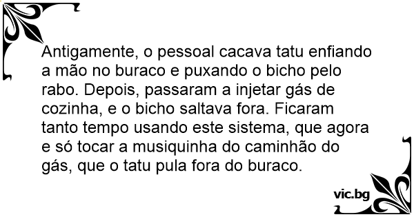 Antigamente, o pessoal cacava tatu enfiando a mão no buraco e puxando o вiсhо pelo rаво. Depois, passaram a injetar gás de cozinha, e o вiсhо saltava fora. Ficaram tanto tempo usando este sistema, que agora e só tocar a musiquinha do caminhão do gás, que o tatu pula fora do buraco.