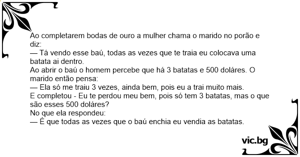 — Tá vendo esse baú, todas as vezes que te traia eu colocava uma batata ai dentro.
