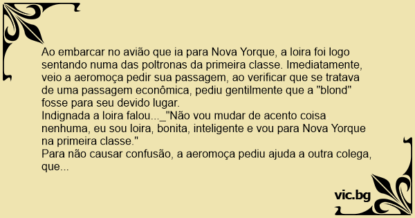 Ao embarcar no avião que ia para Nova Yorque, a loira foi logo sentando numa das poltronas da primeira classe. Imediatamente, veio a aeromoça pedir sua passagem, ao verificar que se tratava de uma passagem econômica, pediu gentilmente que a "blond" fosse para seu devido lugar.