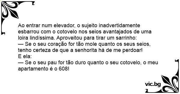 В асансьор на хотел без да иска мъж удря с лакът в гърдите млада дама. - Ох, извинете! Ако сърцето ви е толкова меко и топло колкото гърдите ви, ще ми простите... - Ако онази ви работа е толкова твърда, колкото и лакътя ви, то тогава сте поканен в моята стая - номер 324... - му отговаря тя.