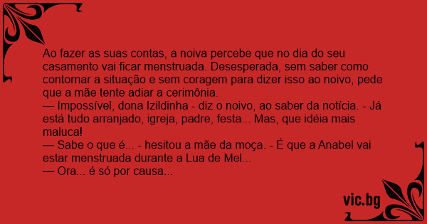 — Sabe o que é... - hesitou a mãe da moça. - É que a Anabel vai estar menstruada durante a Lua de Mel...